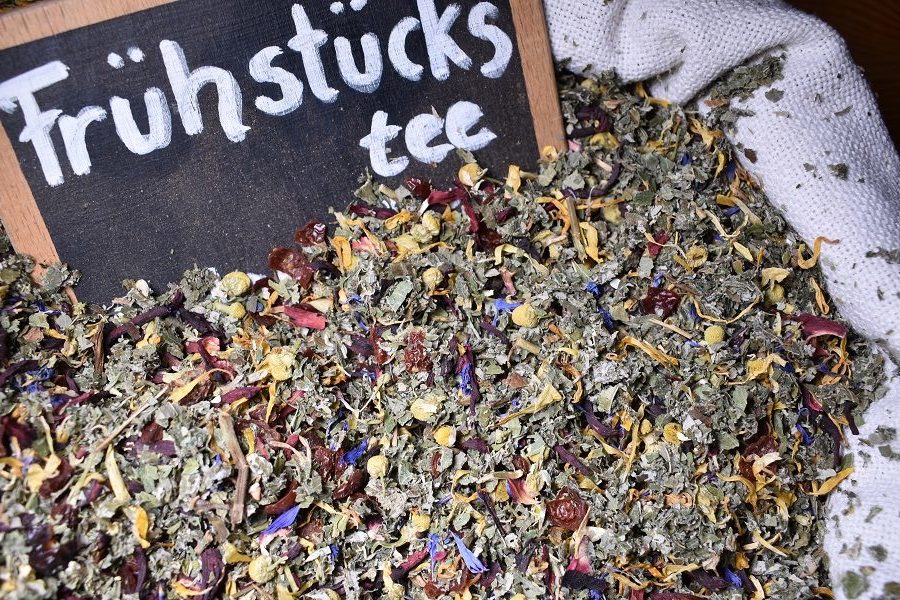 Aufwecker mit Hagebuttenschalen, Hibiskus, Himbeerblätter, Brombeerblätter, Kamille, Pfefferminze, Ringelblume und Kornblume